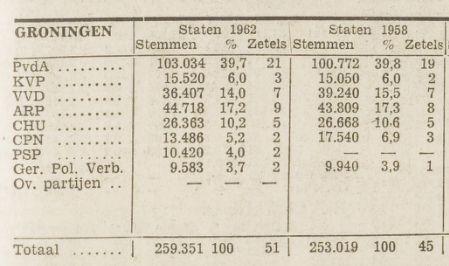 Het politieke landschap was vrij stabiel. De percentuele verschuivingen waren minimaal. Op links pakte de nieuwkomer PSP, landelijk de grote winnaar, in Groningen 2 zetels.  De CPN daarentegen, moest 1 van haar 3 zetels inleveren. En dat terwijl het zetelaantal van 1958 op 1962 uitgebreid werd, iets waarvan vooral de PvdA profiteerde. De stemming moet destijds erg sip geweest zijn in het Groninger hoofdkwartier der communisten. Op rechts profiteerden de KVP, ARP en GPV van die zeteluitbreiding – CHU en VVD bleven op dezelfde aantallen steken.