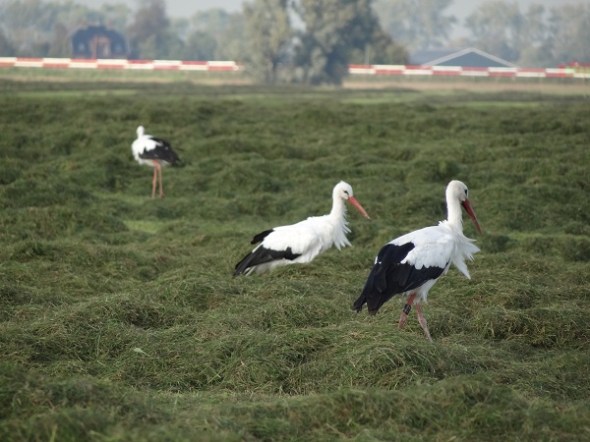 Drie van de twaalf ooievaars in hooiland bij Den Horn: