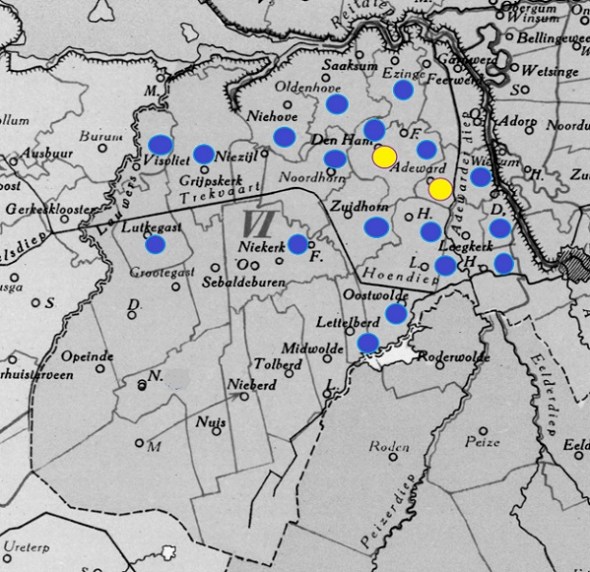 Ik beperk me even tot der twee belangrijkste minderheden: katholieken en doopsgezinden. In het Westerkwartier zijn er in 1809 alleen meer dan 7 % katholieken (geel) in Aduard en Den Ham. Je vraagt je af of dat misschien samenhangt met het rond 1600 gesloopte klooster – in de hervorming van Aduard zou wel eens een aardig onderwerp van studie kunnen zitten.