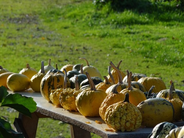 Uitstalling van pompoenen en kalebassen langs de weg van ’t Faan naar de Dijkstreek:
