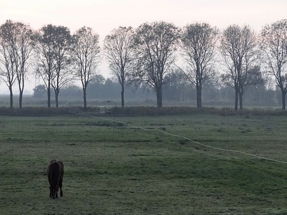 Witte paarden bij populierenlaan en gebraakte grond, Jonkersvaart:
