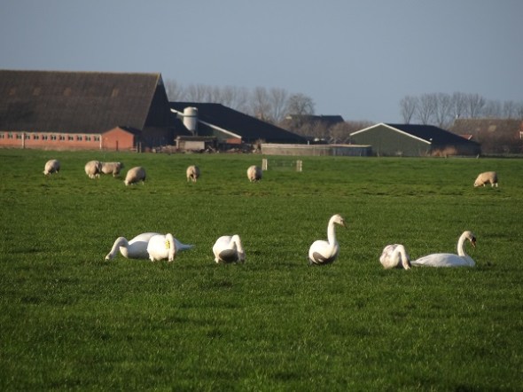 Groep grazende zwanen  in land bij Den Horn: