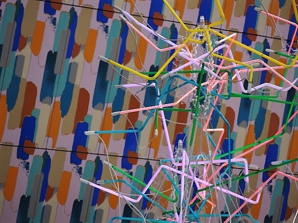 Een driemensionale droedel van Chihuly onder de blote hemel bij het Groninger Museum:
