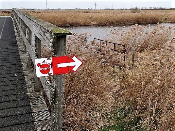 Peizerdiep. Aan het hondepad te zien, zijn vele Drentse fietsers hier aan deze kant van de brug naar rechts en omlaag gegaan: