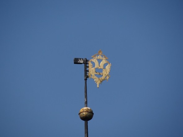 Op de dakruiter staat een windvaan met het wapen van de stad Groningen: