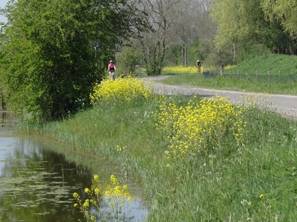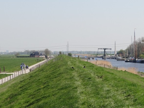 Links het nieuwe fietspad, het gedeelte langs de dijk – rechts het Reitdiep met de brug van Garnwerd: