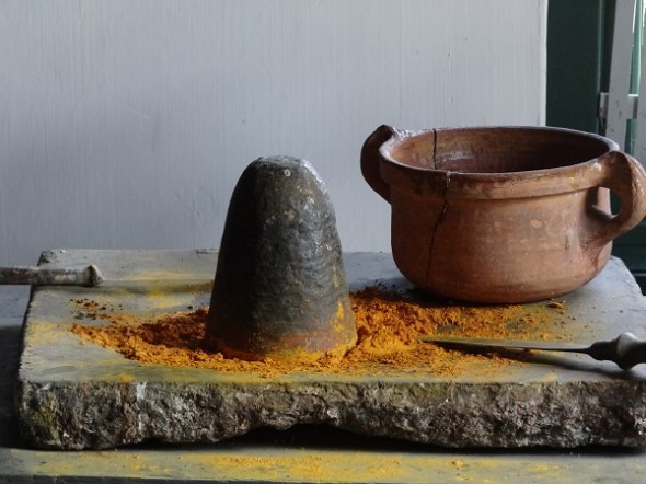 Stilleven van een wrijfsteen met pigment in de ververswerkplaats: