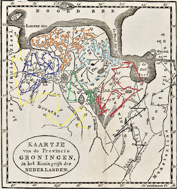 Zelfs de kleinste kerkdorpen zijn meegenomen. Per landschap volgde Kremer verder een route (zie de kleurtjes), die soms uiterst grillig is, met zigzagbewegingen en grote sprongen, wat je de lieve kleinen nou juist niet zou willen aandoen. Die zijn didactisch gezien veel meer gebaat bij heldere opeenvolgingen. Zo zat de veenkoloniale trits Hoogezand-Sappemeer-Veendam-Wildervank-Oude Pekela-Nieuwe Pekela er later zo ingehamerd, dat zelfs menige Indonesiër haar na tientallen jaren nog feilloos op wist te dreunen.