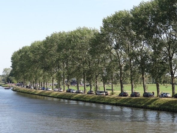 Op de terugweg was dit het beeld van de Dorkwerderbrug naar de Dorkwerdersluis. Zelden staat hier een auto langs het Van Starkenborghkanaal, of hooguit eentje van een visser – nu vele tientallen: