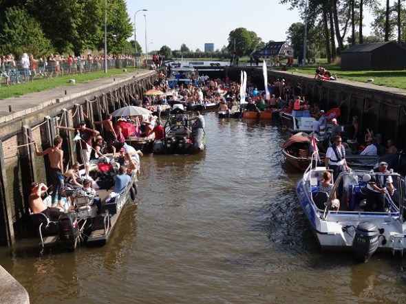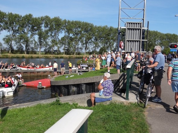 Bij de sluis honderden mensen. Tientallen bootjes liepen binnen vanaf het Reitdiep en ik begreep van een omstander dat er een zwemestafette Zoutkamp-Groningen aan de gang was; met de bootjes overbrugden de zwemmers het linke kruispunt Reitdiep – Van Starkenborghkanaal: