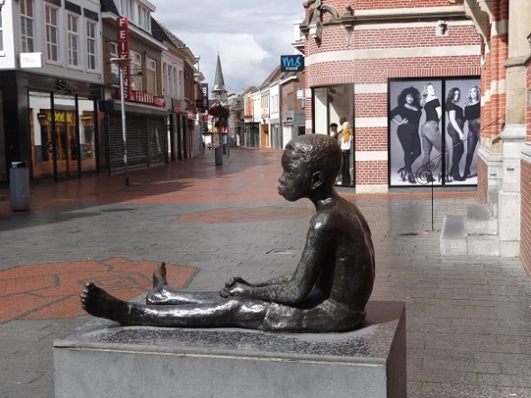 De Langestraat met ‘De zoon van Toela’, een beeld van Toos Hagenaars voor het oude gemeentehuis van Winschoten: