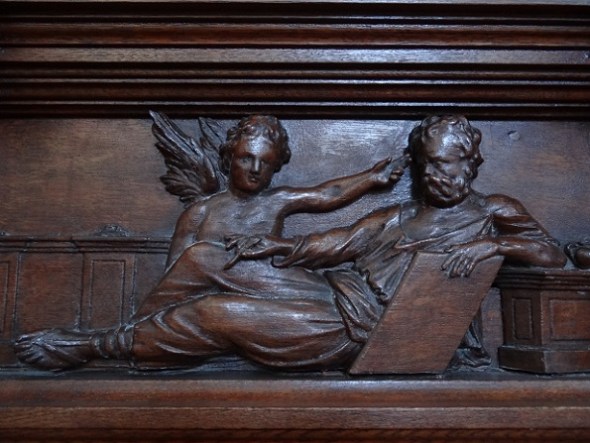 Paneel op de kansel: Alsof het engeltje de man met een denkbeeldig pistool bedreigt, of reikt hij hem een telefoon aan?