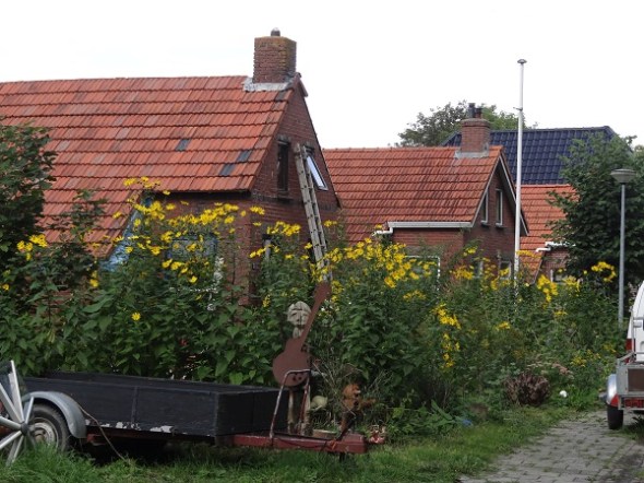 Verderop verkeert die straat in een treurige toestand. Op een sloopplek is dit merkwaardige tuintje ingericht:
