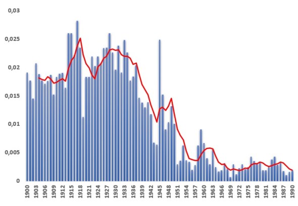 Om zowel karnemelkse pap (met spatie) als karnemelksepap (zonder spatie) te vangen, heb ik gewerkt met het zoekwoord karnemelks*. Verder laat de grafiek niet de absolute aantallen zien dat die zoekterm in de Delpherkranten voorkomt, maar de aantallen als promillage van alle krantenartikelen van dat jaar in Delpher. Om de al te grote fluctuaties wat weg te werken en de ontwikkeling wat beter in beeld te krijgen heb ik er nog een vijfjaarlijks gemiddelde (in rood) overheen gegooid.