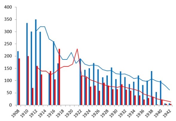 Ben ooit eens een avond aan het stoeien geweest met de aantallen paarden en koeien die werden aangevoerd op de Wedder najaarsmarkt. Meen dat ik de cijfers uit krantenverslagjes haalde, ze leverden in elk geval dit grafiekje op dat ik jarenlang kwijt was maar zoëven weer terugvond: