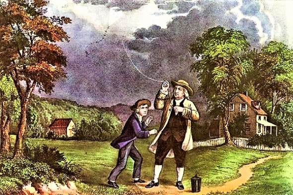 Mooie afbeelding van Ben Franlkin en zoon William met het vlieger/ bliksem project waarbij eerlijk gezegd de eerste twee paragrafen met de beschrijving van de gedachtenwegen voor en tegen bliksemafleiders, voor mij genoeg verlichting was. Ik had deze uitleg inderdaad nooit gehoord.