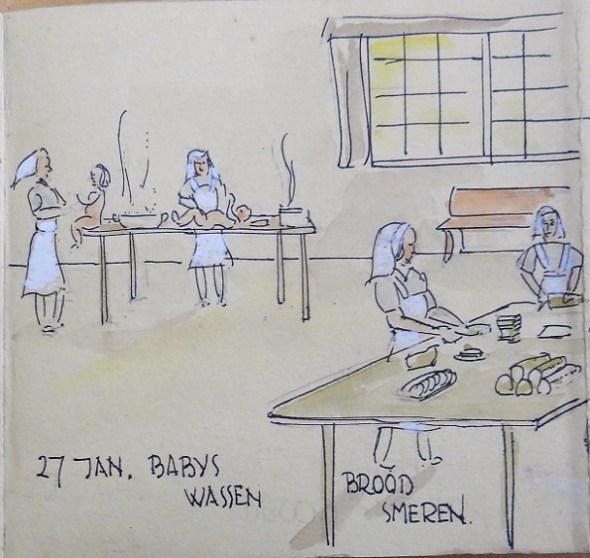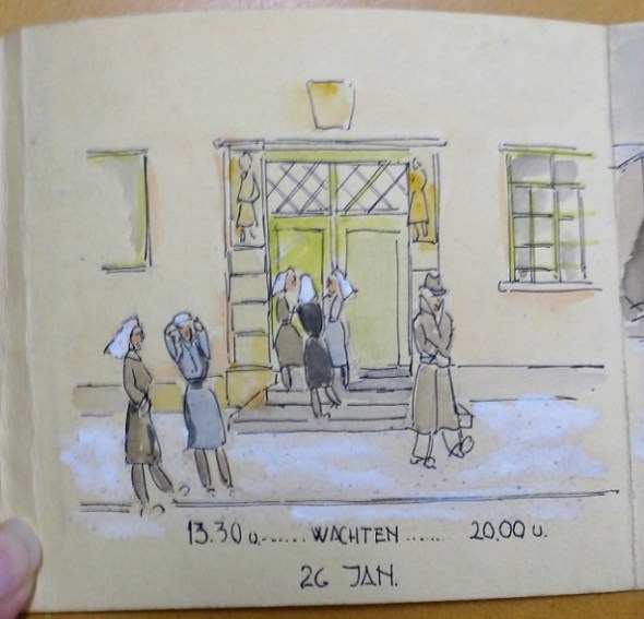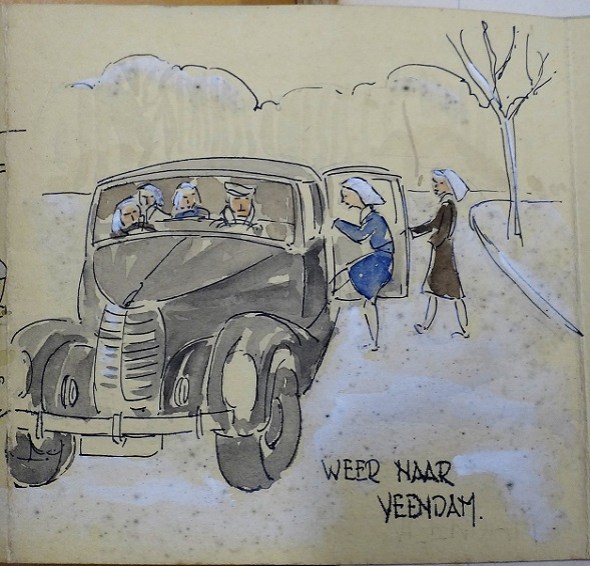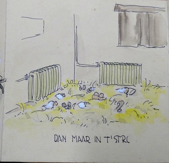 In een cahier met de getekende oorlogsdagboeken van landschapsarchitect Geke Hollema (1919-1991) zit een soort strip opgevouwen, over de opvang van Roermondse evacué’s in Stadskanaal, op 26 en 27 januari 1945. Hollema was daarbij, waarschijnlijk als chauffeur van een ploeg verpleegsters uit Veendam. Hier volgt zijn strip: