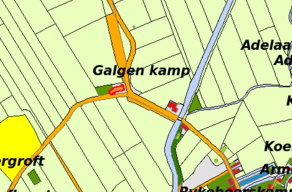 De Galgenkamp bij Meppel, met rechts de Drentse Hoofdvaart en de Venebrug (nu Galgenkampsbrug), links de Zomerdijk of weg naar Zwartsluis, en boven de weg richting Steenwijk en Assen. Bron: http://www.hisgis.nl