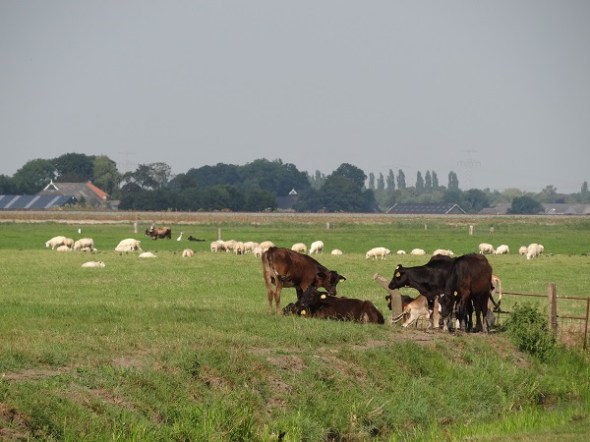Door grazige weiden. Op de achtergrond ontwaar ik nu een ooievaar,. In totaal heb ik her en der een 15 à 20 stuks gezien, meest in plukjes van 4 of 5: