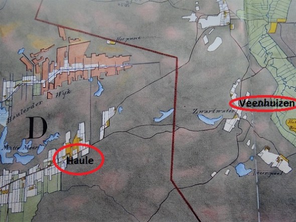 Het gebied ter weerszijden van de Drents-Friese grens tussen Veenhuizen en Haule, ca. 1824. Kaartje ontleend aan H.J. Versfelt en M. Schroor, De Atlas van Huguenin (Groningen/Veendam 2005).