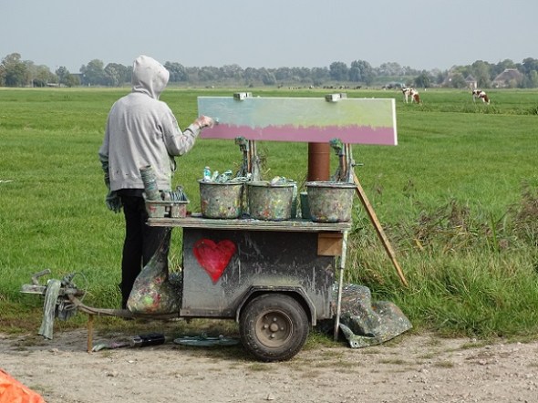 Bij de Zijlvesterweg was de plein-airschilder Gertjan Scholte-Albers (website) bezig met het opzetten van een breed landschap met in de verte Dorkwerd: