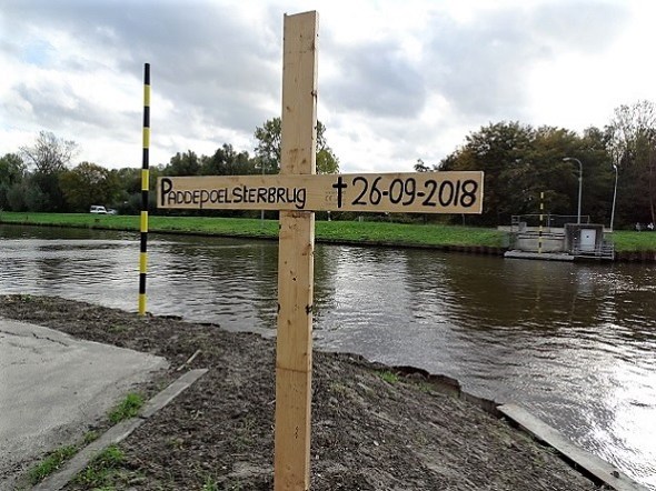 Mooi, dat R.I.P.-bord voor de verdwenen Paddepoelsterbrug. Begrijpelijk dat omwonenden daar not amused over zijn en dat ze dat op die manier uiten. Is al bekend of en wanneer er een brug terugkomt voor de Paddepoelsterbrug? Ik lees in een bericht dat Rijkswaterstaat in 2019 een tijdelijke fietsbrug heeft toegezegd die in 2021 gerealiseerd zou moeten worden, in afwachting van een definitieve oplossing, maar latere berichten betwijfelen of er nog iets terugkomt. Maar wellicht ken jij, Harry, uit de lokale media de laatste stand van zaken?