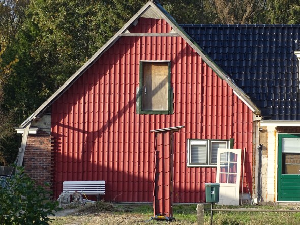 Hoezo tijdelijke dakpannen op die voorgevel in Leek? Gaat iemand daar echt die hele gevel eerst vollijmen met dakpannen en die er later weer afhalen en vervangen door klinkers? Dat doet iemand toch niet zomaar voor de lol. Is dat een kunstproject ofzo?
