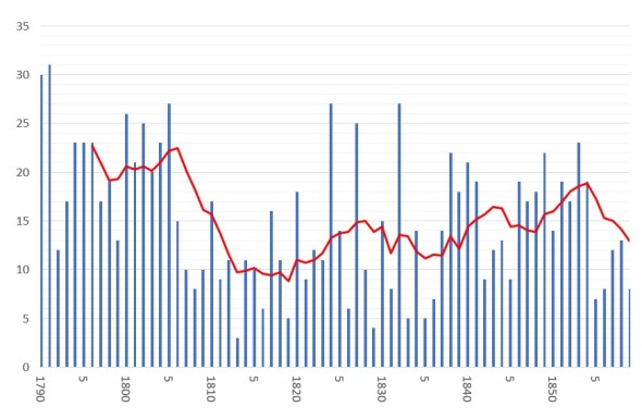 De meeste boerenboekhoudingen uit het Oldambt die ik zag, bevatten alleen het “gemaak”, dat wil zeggen de omzet van granen (gerst, tarwe, haver), zaden (kool-, raap-, aweel- en mosterdzaad) en peulvruchten (erwten en bonen). De omzet uit dierlijke producten, boter maar ook ossen bijvoorbeeld en opgefokte paarden, was vergeleken daarbij vaak niet noemenswaard. Jacob Jans en Jan Jacobs de Groot daarentegen, noteerden in de periode 1790-1859 zulke inkomsten wel en ik bleek ooit eens te hebben uitgerekend welk percentage die van de gehele bedrijfsomzet uitmaakten. Die percentages staan in bovenstaande grafiek per jaar in blauw, met in rood de voortschrijdende zevenjarige gemiddelden om door de al te grote fluctuaties de ontwikkelingen op termijn beter te kunnen zien.
