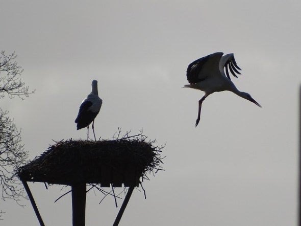 Bij de Schapenweg, hoek Scheperij hoorde ik het geklepper van ooievaars. Was niet te laat voor een foto, pa ooievaar ging eens takken scoren: