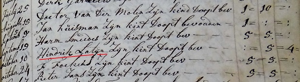 En daar duikt opeens een Hindrik Latijn op in de diaconierekening van Nieuwolda. Zijn doopgift op 10 oktober 1784 van een sestehalf (=5,5 stuiver), destijds traditioneel voor kleine middenstanders, steekt nogal mager af bij de omringende: allereerst natuurlijk bij de daalder van “doctor” Van der Molen, die een paar jaar later pardoes zijn dienstmeid door het hoofd zou schieten, maar des te meer nog bij de ducaat (5 gulden en 5 stuivers) die afkomstig was van ‘dikke’ boeren als Harm Smeedes, F. Fockens en Pieter Jans.