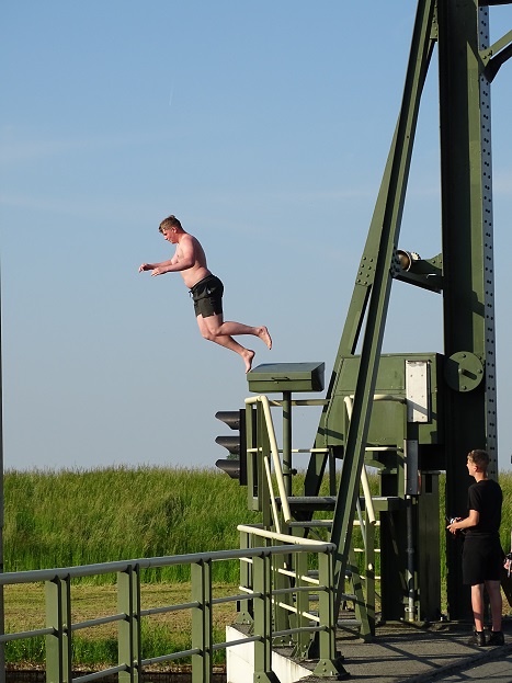 Via Feerwerd en Garnwerd naar de andere kant van het Reitdiep. Jongen springt van de brug in Garnwerd: