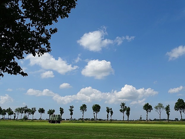 Vanmiddag via Zuidhorn naar Humsterland en Middag. Afgehaald hooiland bij Oldehove – op de wagen in de verte probeert een man die ronde balen vast te sjorren: