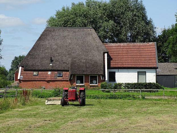 Boerderijtje bij de A7 in de Kleine Oostwolderpolder, met een oud trekkertje ervoor: