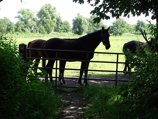 Het was niet heel warm, gewoon lekker weer. Toch zochten deze paarden in de Lettelberterpetten het streepje schaduw bij het hek op: