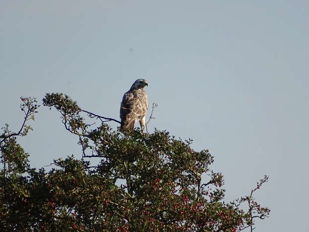 Bij Balmahuizen aan de andere kant van Noordhorn een buizerd op de uitkijk bovenin een boom: