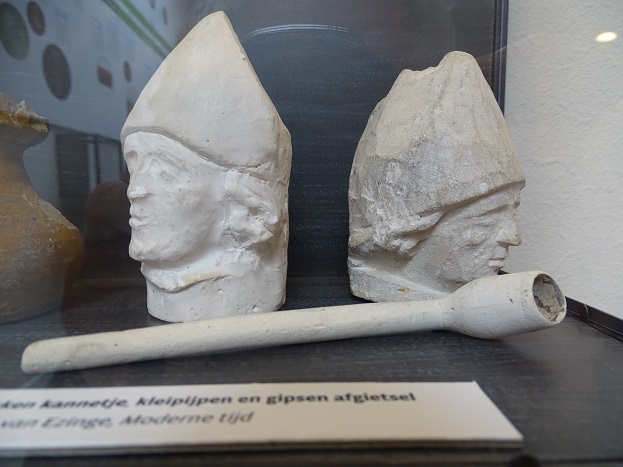Museum Wierdenland, Ezinge: een kort tabakspijpje en gipsen afgietsels van kopjes, aangetroffen in de kerk van Ezinge. Die kopjes komen volgens mij uit de Franse Tijd en ik vraag me af van wat voor voorstelling ze deel uitmaakten: