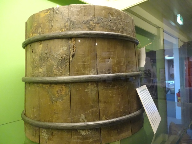 Emmer van taxushout uit de Romeinse Tijd, gevonden in Winsum-Bruggeburen. Taxus, ook wel venijnhout geheten, is giftig, maar van het water uit zo’n emmer ga je niet dood, terwijl het wel ontsmet is. De duigen zijn overigens gereconstrueerd van plastic: