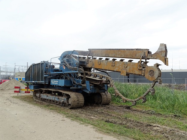 Het voorwereldse monster (sleuvengraver) te Vierverlaten staat werkloos langs de oprit met een kapotte of erafgelopen graafband: