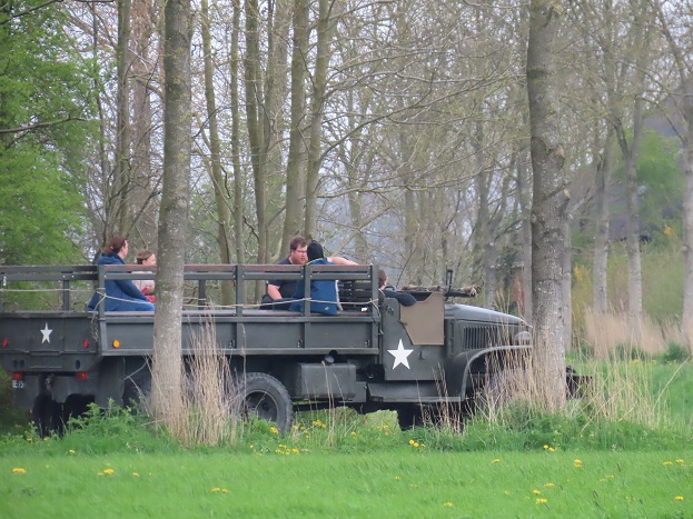 Amerikaanse legertruck met keuvelende jongelui bij Allersma, waarschijnlijk een herdenkingstour of of zo: