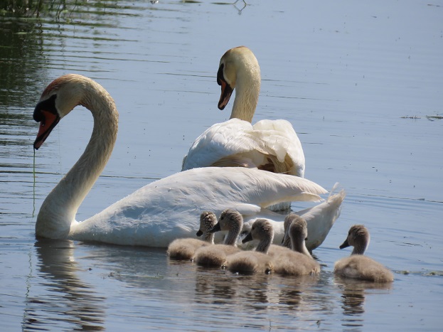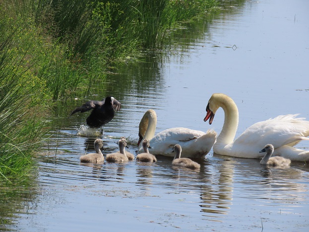 Terwijl pa en moe zwaan meneer meerkoet duidelijk maken dat ze hier niet van gediend zijn, kruipen hun jongen bangelijk achter ze weg. (Meerkoet houdt zich verder gedeisd.):
