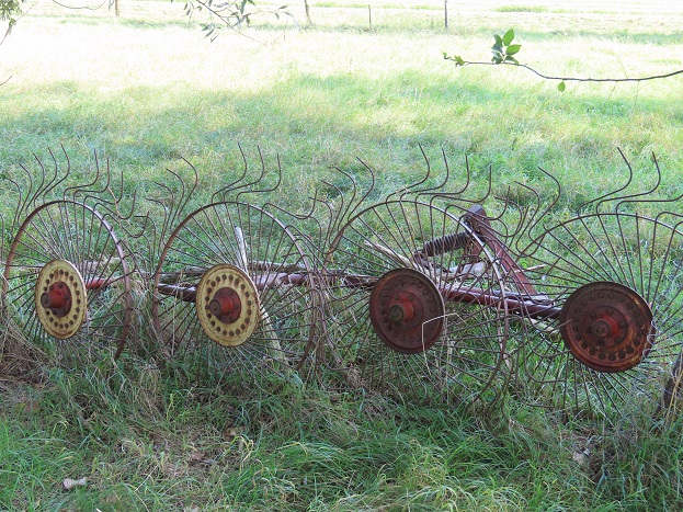 Geert Pruiksma directeur van Museum Nienoord en samensteller van deze expositie vond het blijkbaar wel een aardig idee een echte, maar aan het ene rad te zien nogal gemankeerde ploeg bij de schilderijen neer te zetten.