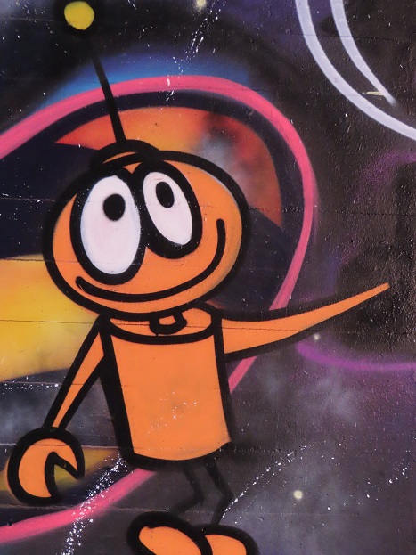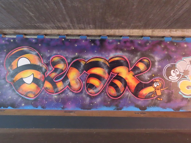 De fiets voor het archief neergezet. De nieuwe graffiti’pieces’ onder het Emmaviaduct met ruimtevarende Micky Mouses had ik al gezien: