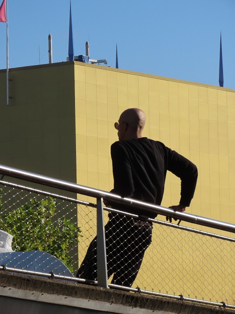 Was een beetje op het stadsbalcon heen en weer aan het flaneren, en toen stond deze figuur mooi contrastrijk tegen het geel van de golden museumtoren uitgelicht. Hij had me wel in de gaten, getuige een andere foto. Het was dus geposeerde onverschilligheid.