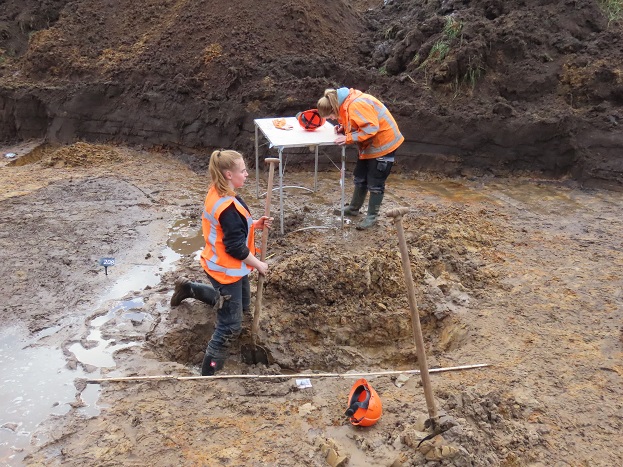 In het gele zand van de ondergrond tekenden zich donkere ronde vlekken af. Ooit laagtes waaarin zich hemelwater ophoopte en/of mensen rotzooi en mest stortten. Volgens de archeoloog die een en ander toelichtte, Roeline Rap van De Steekproef, ging het om ‘putten’, vooral uit een later periode. Aan de rand was zo’n put ondiep, maar als je naar het midden liep, kon je wel drie meter wegzinken.