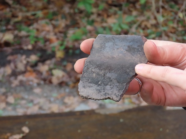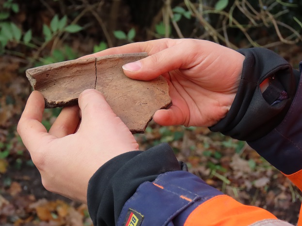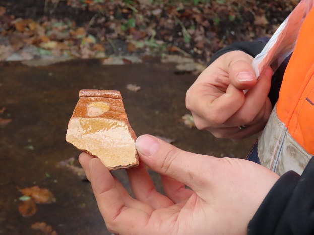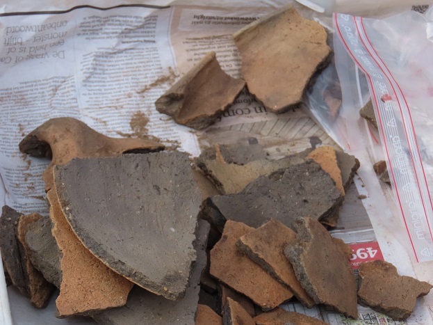 Deels geglazuurd stukje aardewerk uit een veel latere, vroeg-moderne periode (16e-17e eeuw). Dit werd op voorhand niet zo verwacht, maar het lag er dus wel, en dat in tot tevredenheid stemmende hoeveelheden.