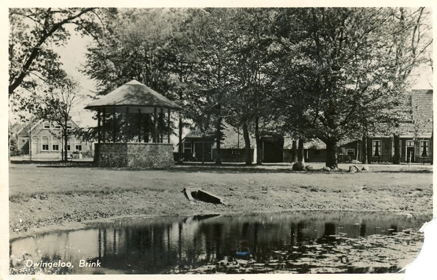 Uit een stapeltje ongesorteerde paperassen en boeken viel deze ansichtkaart van Dwingeloo, verstuurd in de jaren vijftig. Afgebeeld zijn de Riete of de laatste braandkoele op de Brink aldaar, d.w.z. een kuil voor bluswater op de voorgrond met een sluisje voor periodieke aanvulling met regenwater, en op het middenplan de muziekkoepel waar regionale fanfares in de zomer onderling een concours hielden, terwijl je op de achtergrond een ouwe Saksische boerderij met meerdere baanders en woningen naast een moderner , vooroorlogs middanstandspand ziet staan.