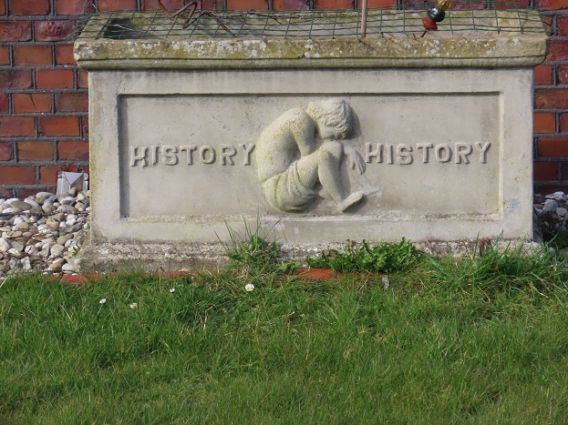 In het buurdorp Sauwerd nog een merkwaardig opschrift op een bak onderaan een muur. Een jongen heeft zich veel te veel in de geschiedenis verdiept en moet daarom nu huilen, want daar komt niets goeds van: