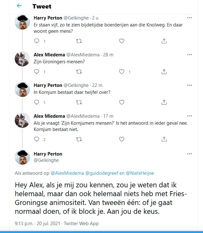 Geplaatst op: 21 juli 2021 Hoort bij: autobio, Ommelanden 13 reactiesEr ontvouwde zich gister een aardige conversatie op Twitter. Iemand uit Eindhoven, Guido de Greef, had hier in Groningen de hoogste postcode van Nederland (9999 ZZ) bezocht, bij de Knolweg onder Stitswerd. Omdat hij beweerde dat hier geen mens woonde, en ik me dat anders herinnerde van mijn fietstochten, ging ik eens bij Google Maps te rade, waaruit bleek dat er inderdaad nog een handvol boerderijen aan de Knolweg staat, die zo te zien ook nog in vol bedrijf zijn. Dat merkte ik dus tegen Guido op, waarna ene Miedema van even boven Leeuwarden erop insprong met een opmerking over Groningers die niet als grap of ironie gemarkeerd was en die ik dus wel moest zien als onaangenaam, kwaadaardig en ziek: