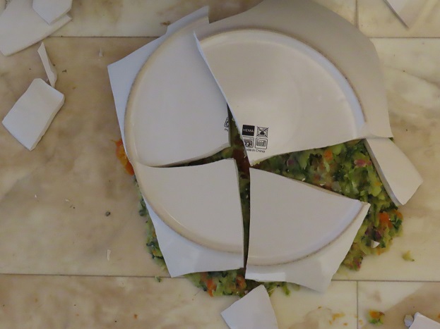 En daar ging mijn lekkere prakkie stamppot met restanten aardappelen-wortels-andijvie-kaas-en-spekkies. In een glijdende beweging elegant vanaf het aanrecht omgekeerd op de keukenvloer. De katten, altijd bereid tot hulp, begonnen meteen wat kleinere scherven naar de huiskamer te sjouwen, Gelukkig zat nog ongeveer een derde van de hoeveelheid prak in de pan. Kon, toen ik de grootste scherven had opgeruimd, ook nog wat van de hoop afschrapen- d.w.z. het deel dat niet in aanraking met de keukenvloer was geweest. Want om nou rechtstreeks van de vloer te eten, zie ik mij niet doen. Sommige mensen mogen dan beweren en dat je daar weerstand mee opbouwt, maar daar geloof ik niet zo in. De rest van de prak is meteen de vuilcontainer in gegaan. Zo zit je te koken, zo mik je het weg.