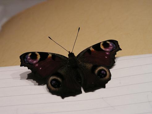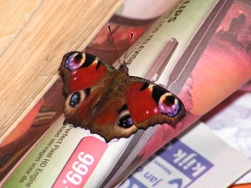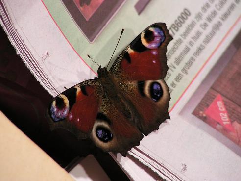 Een paar weken geleden fladderde hij hier ook al een paar keer ’s avonds in de kamer rond. Hij hoort eigenlijk op een koele plek te overwinteren, maar zoekt hier de lampen op.